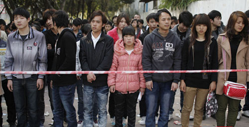 1月31日,位于深圳龙华的富士康,大门外排满了节后慕名而来的求职者。数百人的等待招聘的队伍里显现众多稚气的面庞。尽管还没有到招募时间,但很多人都想先占上位。