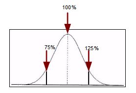 说实话,这并不是人力资源从业人员通常所讨论的内容。我们使用"比较比率(compa-ratio)"这一术语,并把它描绘成围绕着我们将其称之为100%的中点。这是一个完全相同的图形,只除了我们使用了不同的标记方法。像下面这样: