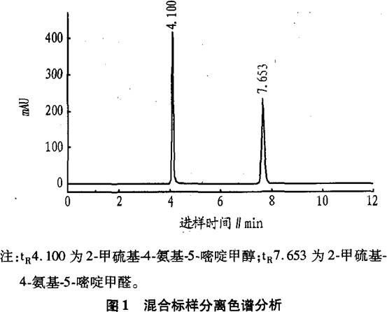 嘧啶类化合物广泛分布于生物体内,在生理和药理上都具有十分重要的作用,并且在农药和医药合成中得到了广泛的应用。2一甲硫基4氨基一5 -嘧啶甲醛是近年来新研发的一种嘧啶胺类农药,是以2一甲硫基4氨基.5 -嘧啶甲醇为原料氧化合成的。研究两者的分离及定量检测对跟踪该反应及确定两者的纯度具有实际意义。莫卫民等采用高效液相色谱分离测定了2一甲基_4 -羟基-苯基嘧啶和2.甲基4-羟基-5 -溴-6-苯基嘧啶;Wang等采用ESI-MS/MS分离非对映体嘧啶类乙二醇;Luo等采用磷脂膜色谱分离35种嘧啶类衍生物。但关于2一甲硫基4 -氨基-5-嘧啶甲醛和2.甲硫基_4 -氨基一5 -嘧啶甲醇的分离测定还未见报道。因此笔者采用反相高效液相色谱法,使用C18色谱柱和紫外检测器对2一甲硫基4 -氨基.5-嘧啶甲醛和2一甲硫基-氨基_5-嘧啶甲醇进行了分离测定,方法准确、快速。
