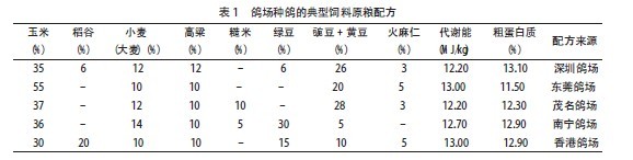 因为鸽子喜食谷物籽实,长期以来鸽子的饲粮以原粮为主。原粮包括玉米、小麦、稻谷、高粱、豌豆、绿豆、火麻仁等,一般能量饲料占70%~80%,蛋白饲料占20%~30%。我们调查了广东、香港、广西部分鸽场,各地种鸽的典型原粮配方见表1。