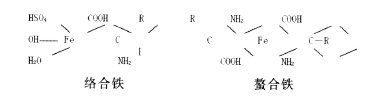 铁元素与有机酸、氨基酸、小肽、蛋白质和多糖衍生物等配位体(供体)通过离子键或共价键结合而成的络合物(或螯合物)。络合铁通常是一个铁元素与一个有机酸构成的,它们之间以简单的离子键相连,只有一个结合点。螯合铁结构比较复杂,它一般由一个铁元素通过至少两个键与一或两个配位体构成。例如,氨基酸螯合铁中,铁与两个氨基酸形成4个键,其中两个键是铁与氧形成的离子键,结合力一般很弱,另外两个是铁与氮形成的共价键,结合力相对较强。螯合铁也称内络合铁,由于它的环状结构,通常比络合铁稳定。键的类型和强度是影响络合物稳定性和生物利用率的重要因素。美国官方饲料监测局(MFCO,1996)确定的有机铁定义:对氨基酸和蛋白质金属螯合铁,是指可溶性盐的铁离子同氨基酸按照1:1~3(最佳为1:2)的比例反应,生成配位的共价键所得产物。水解氨基酸的平均分子量为150,生成的螯合铁分子量不得超过800。