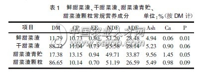 甜菜渣或称甜菜粕,是甜菜在制糖过程中,经切丝、渗出、充分提取糖分后含糖很少的菜丝,亦称废糖渣,是制糖工业的副产品。它具有柔软多汁、营养丰富、适口性强、消化率高和价格低廉等优点,是家畜良好的饲料。鲜甜菜渣、干甜菜渣、甜菜渣青贮、甜菜渣颗粒中的常规营养成分含量见表1。