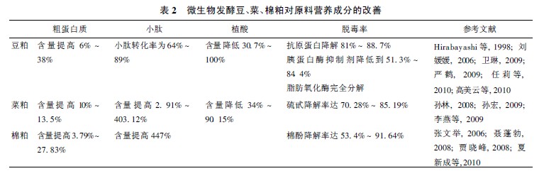 微生物发酵豆、菜、棉粕可以改变饲料原料的物理特性,改善适口性,提高蛋白质含量,降低粗纤维含量,降解抗营养因子和饲料毒素,从而提高动物对饲料的消化利用率(表2)。