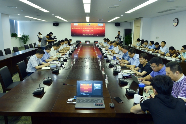 在与会者共同见证下,戴建君、何金雪、邹锐代表三方在《南京农业大学江北新校区代建框架协议》上签字。