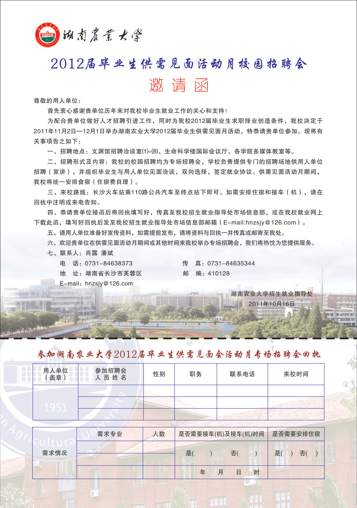 湖南农业大学2012届毕业生供需见面活动月校园招聘会邀请函