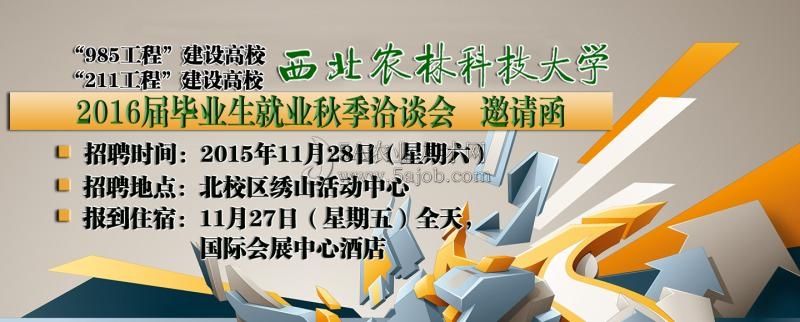 西北农林科技大学是教育部直属全国重点大学,“985工程”、“211工程”建设高校,2016届毕业生共有7500余名,其中毕业研究生2100余名,本科毕业生5400余名。为了帮助毕业生顺利就业,为贵单位选聘适用的毕业生提供方便,同时也更好地扩大贵单位影响,诚挚邀请贵单位参加我校2016届毕业生就业秋季洽谈会。