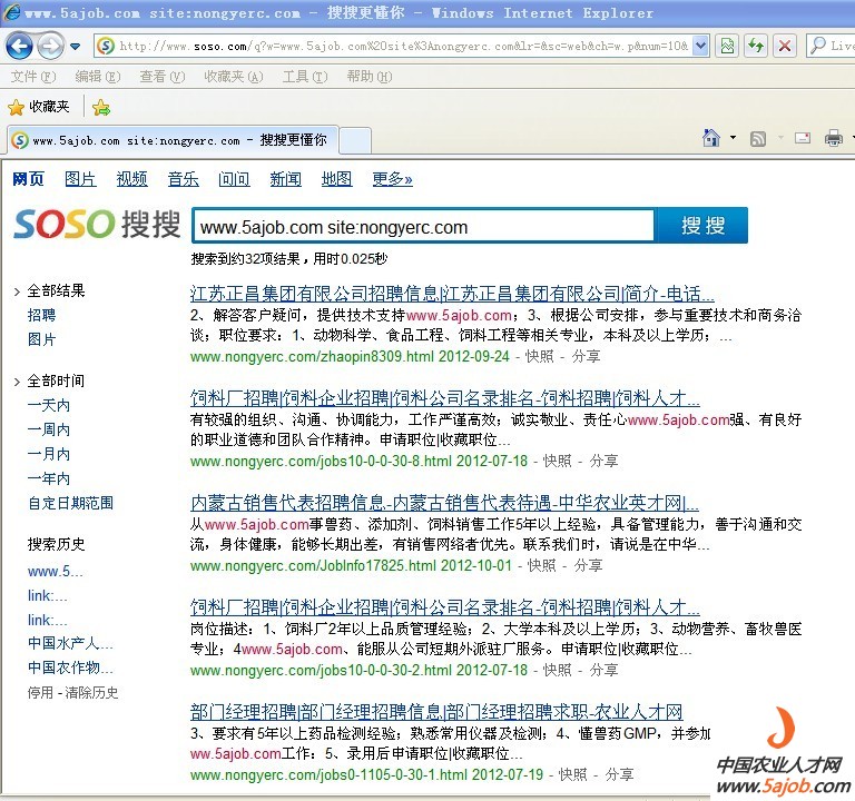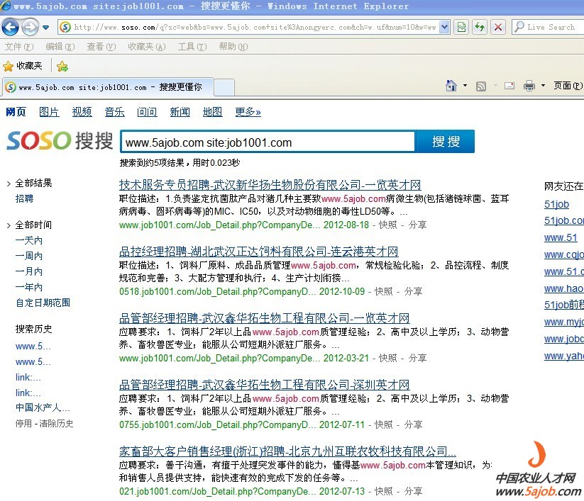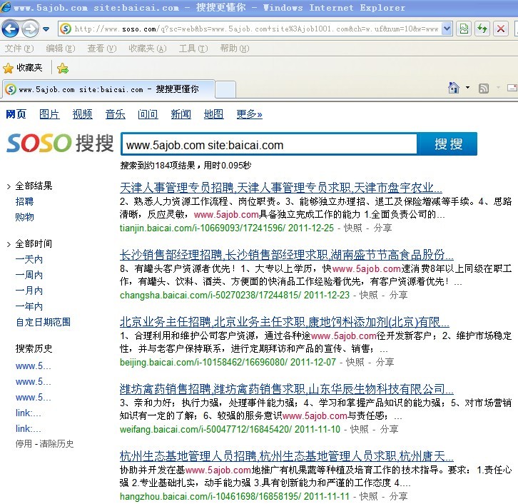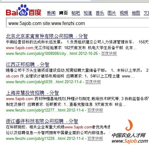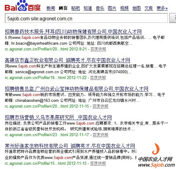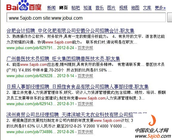 (说明,图中搜索代码 www.5ajob.com site:xxx.com 表示在xxx.com上出现了www.5ajob.com的页面,由于本网在部分职位页面包含版权域名,这些网站非法采用软件采集后显示)
