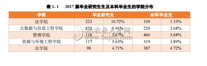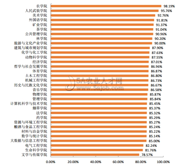 本科毕业生:学校 2017 届本科毕业生分布在 33 个学院,其中农学院(98.19%)、人民武装学院(95.76%)和美术学院(92.76%)毕业生就业率位居前三。