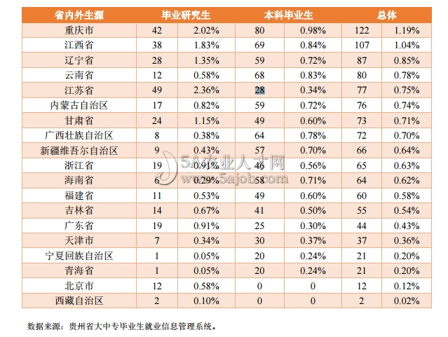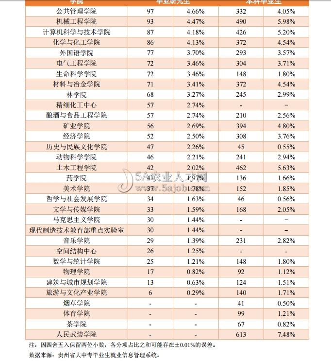 学校 2017 届毕业研究生分布在 33 个学院,其中法学院和大数据与信息工程学院毕业生人数最多,占比分别为 10.72%和 5.91%;本科毕业生分布在 33 个学院,其中人民武装学院和机械工程学院毕业生人数较多,占比分别为 7.48%和 5.98%。表 1- 1 2017 届毕业研究生生及本科毕业生的学院分布