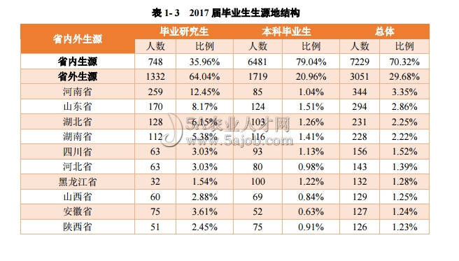 学校 2017 届毕业生来自全国 30 个省(市/自治区),以贵州省生源为主,所占比例为 70.32%;省外生源主要来自河南(3.35%)、山东(2.86%)、湖北(2.25%)等省(市/自治区)。