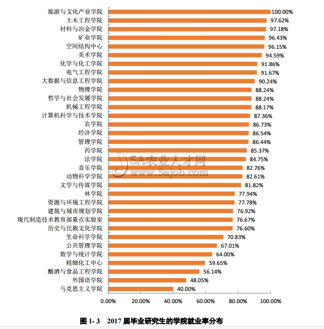 毕业研究生:学校 2017 届毕业研究生分布在 33 个学院,其中旅游与文化产业学院学院毕业生就业率最高,达到了 100.00%。