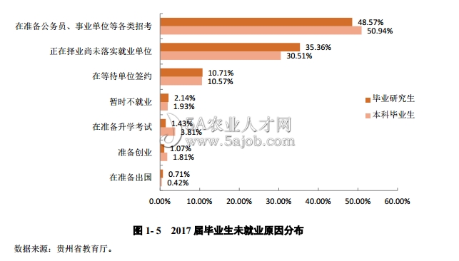 学校 2017 届未就业的毕业生共 1363 人(占比 13.26%,其中毕业研究生 386人,本科毕业生 977 人),对未就业毕业生进一步调研显示:毕业研究生中,未就业的主要原因包括“在准备公务员、事业单位等各类招考”(48.57%)和“正在择业尚未落实就业单位”(35.36%);本科毕业生中,未就业的主要原因包括“在准备公务员、事业单位等各类招考”(50.94%)和“正在择业尚未落实就业单位”(30.51%)。