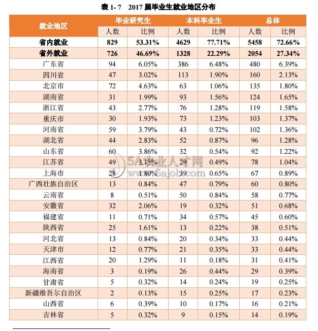 就业区域分布:学校 2017 届毕业生就业地区以贵州省内为主,占比为 72.66%,其中本科毕业生省内就业占比较高,为 77.71%;省外就业人数较多的地区为广东省、四川省和北京市,占比分别为 6.39%、2.13%和 1.80%。