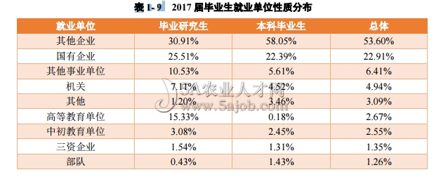 2017 届毕业生主要流向其他企业(民营企业为主),占比为 53.60%;其次为国有企业,占比为 22.91%。