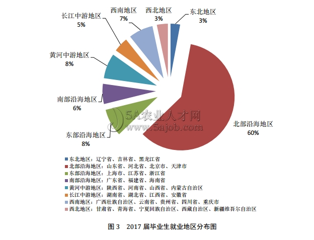 2017 届毕业生就业各地区的分布情况见图 3,北部沿海地区分布最多,占60%;其他各地区共 40%,其中东北、西北地区分布最少,占 3%,见图 3。