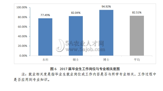 根据北京高校毕业生就业指导中心对中国农业大学 2017 届毕业生进行的抽样调查显示,2017 届毕业生专业相关度平均为 82.51%,比上一年度有所提升。从学历来看,博士毕业生就业相关度最高,为 94.92%,其次为硕士毕业生,为82.04%。毕业生就业相关度与学历成正比,学历越高,就业相关度越高,见图6。
