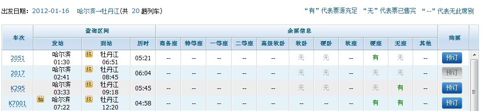3.下面就要去“抢票”了,点击左上角日期下面的“车票预定”按钮,选择“出发地”,“目的地”用简拼去填写,然后用箭头或者鼠标去选择对应城市,例如出发地哈尔滨就输入:heb,然后下箭头选择,回车确定即可。选择好出发日期,最早是可以提前12天预定的,例如5号是可以订16号的票,6号是可以订17号的票,以此类推。输入完成后,点击“查询”按钮,“正在查询,请稍候!”过后就可以看到车次列表了,以及余票信息,例如下面的: