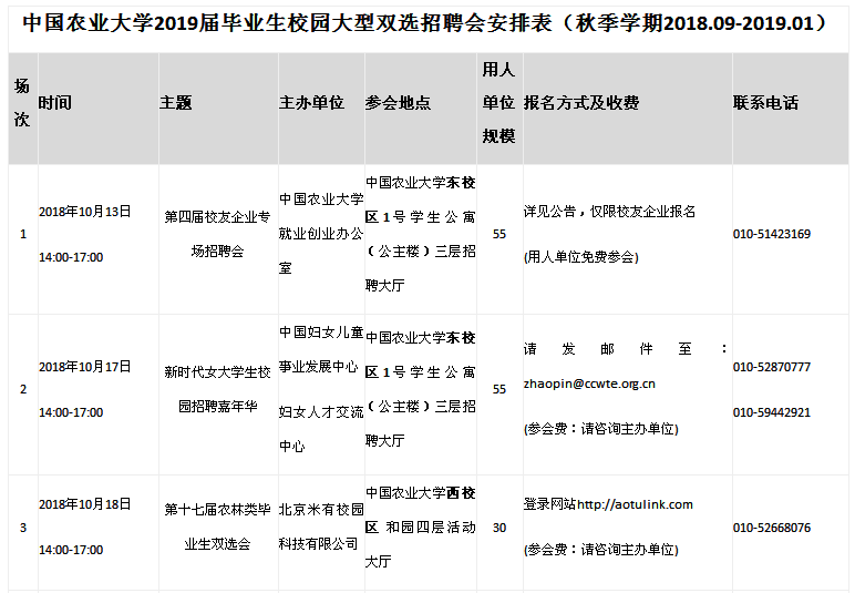 兹定于2018年09月至2019年01月,在我校定期举办多场2019届毕业生校园双选招聘会、并可接待企业举行专场宣讲招聘会,在此诚挚邀请各用人单位到中国农业大学招贤纳才,我们将加大精准推送和宣传力度,组织2019届本、硕、博毕业生参加每场招聘会。
